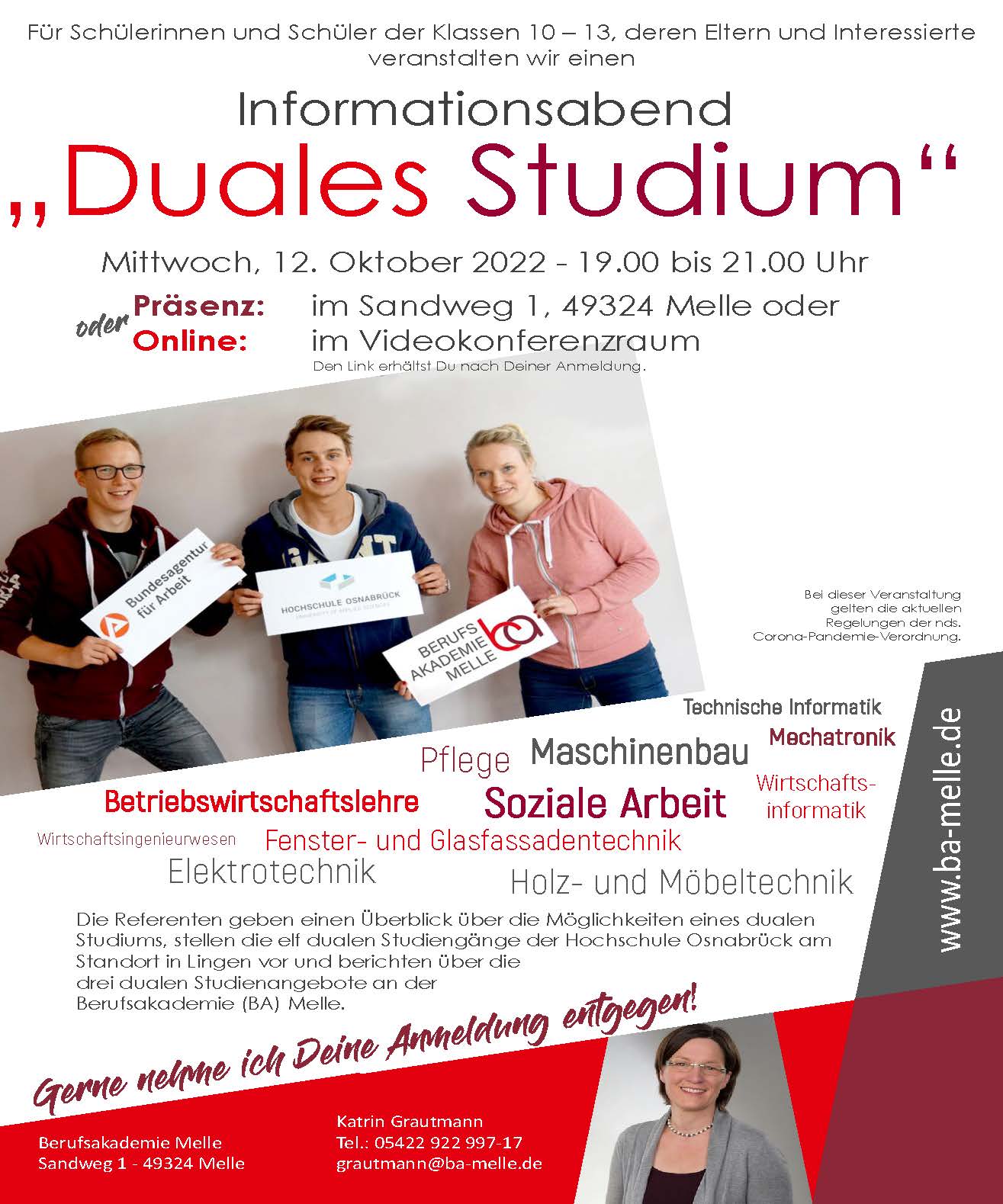 Für Schülerinnen und Schüler der Klassen 10 - 13, deren Eltern und Interessierte veranstalten wir einen Informationsabend "Duales Studium". Die Referenten geben einen Überblick über die Möglichkeiten eines dualen Studiums, stellen die acht dualen Studiengänge der Hochschule Osnabrück am Standort in Lingen vor und berichten über die drei dualen Studiengänge an der Berufsakademie (BA) Melle. Es besteht die Möglichkeit in Präsenz oder Online teilzunehmen. Für die Online-Teilnahme versenden wir nach der Anmeldung einen Link für die Videokonferenz.